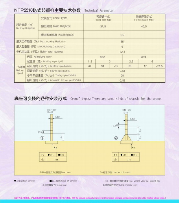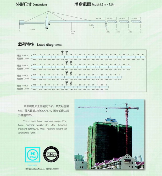 该机的最大工作幅度为55米,最大起重量为6吨,最大起重力矩620KN.m,附着式最大起起升高度140米。